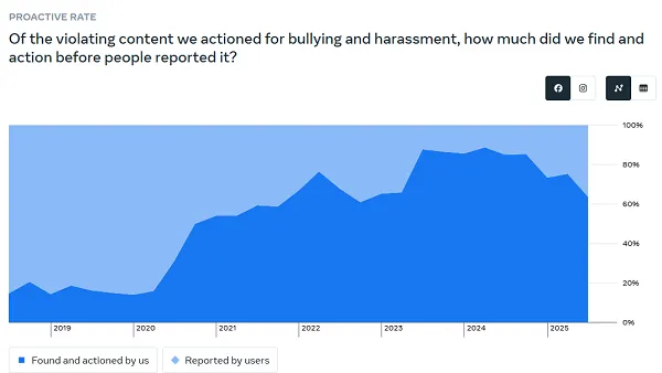 To znajduje odzwierciedlenie w danych. Na przykład w raporcie dotyczącym kategorii „Nękanie i zastraszanie” (bullying i harassment) zaznaczono, że w ciągu ostatnich trzech kwartałów znacząco spadł udział przypadków wykrywanych proaktywnie przez systemy Meta w porównaniu z naruszeniami zgłaszanymi przez użytkowników.
